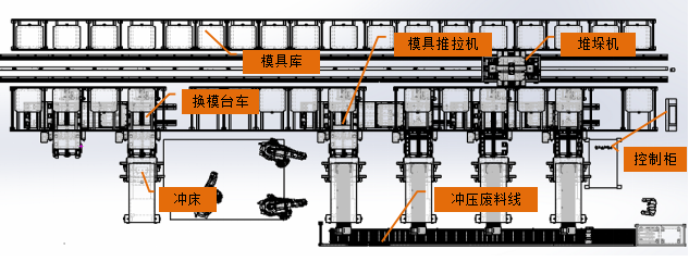 3. 換模階段,模具通過(guò)換模臺(tái)車和推拉機(jī)實(shí)現(xiàn)在沖床正面完成換模流程。